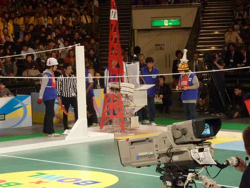 Bチームオフェンスロボットは2つの回転円盤の間からボールを発射する機構でした。ボールを良い形で取り込むことに失敗して,正しく発射できま せんでしたが,レシーバ越えの大遠投を見せたり,天井直撃のボール投げを見せました。ディフェンスロボットも高さ+2WSの俊敏な動きのロボットでした が,隙を狙われ,インターセプトを逃しました。しかし,強力な連続ボール投げをエキシビションでも見せつけ,技術賞を受賞し,全国大会出場を勝ち取りまし た。